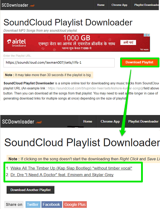 Using SCDownloader to download songs from SoundCloud is pretty easy. Just visit its home page and after that, use the text box to paste the URL of the SoundCloud page where the song is. You can also use the playlist downloader section of the website. After submitting the URL of the playlist, hit the Download Playlist button and it will show you the list of songs from the playlist. You can click on any song to start downloading it.