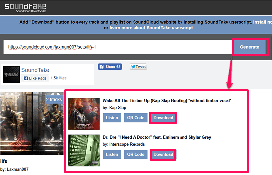 Soundtake is a pretty simple Sound Cloud downloader. Open its home page in the browser and paste the URL of the SoundCloud song in it. You can also paste the URL of the Soundcloud playlist to download all the songs from it. Hit the Generate button and it will process the URL and will show you the download information related to the song or playlist.