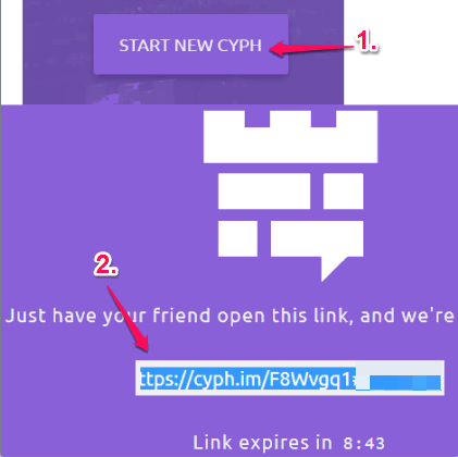 Step 2: Click on START NEW CYPH button available on its homepage. After this, it will automatically start generating a private link for your Cyph room. That link automatically expires within 10 minutes. So you have to send it to your friend before that.