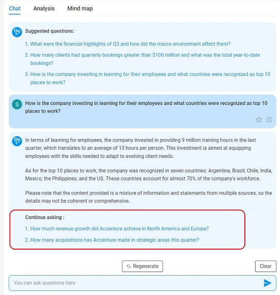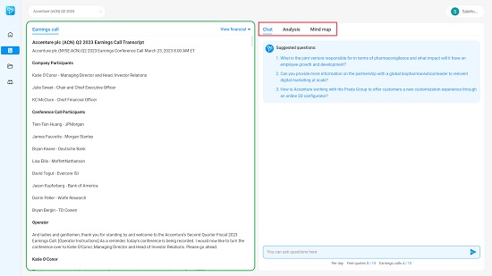 BeeBee.AI is a great tool to analyze high-profile public companies using their earnings calls transcripts and financial reports. The Chat module is very handy to get ready queries that can be used to gain specific insights into certain aspects of the companies. The Mind Map module provides a great outline for the users to systematically browse through the entire text.