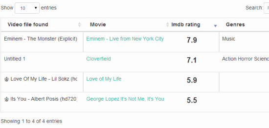 Movies Info (or Movies Collection Info) is a free website that helps to get movies information by using IMDb database. It automatically searches for video files available in your PC folder to generate information. It generates data-table to provide exact name of movies, movies rating, and genres used for all movies. Not only just movies, it can be used to get information about TV serials and video songs as well. The best use of this website is to quickly check rating of movies, if that movie’s information is available in that IMDb.
