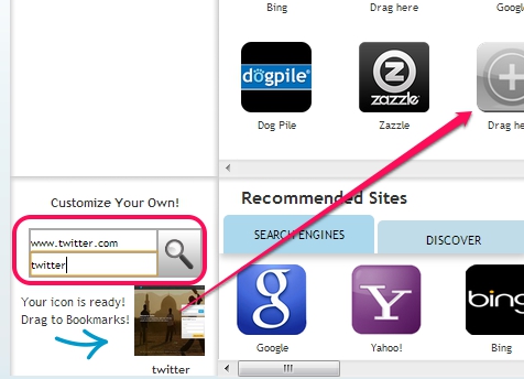 - You can also add your own customized web service with a particular object. Simply choose an object, add web URL of desired service at required place, give a name to your bookmark, and its icon will appear. Now, drag that icon and drop it to bookmarks to add it as bookmark.