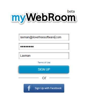 Step 1: Sign up to myWebRoom with your Facebook account or by providing email id, username, and password.