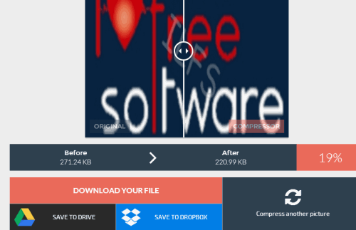 This handy online image compressor also lets you preview the original and compressed image directly on its interface. It is almost impossible to see the difference between original and compressed image. You can download the compressed image or can also store it to your Dropbox and Google Drive account.