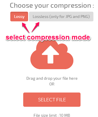 On its homepage, first of all you need to select the mode of compression: lossy or lossless. After this, you can drag n drop any supported image on the required area. SELECT FILE button can also be used to add the required image. Input image must not be greater than 10 MB in size. Only one image at a time can be compressed.