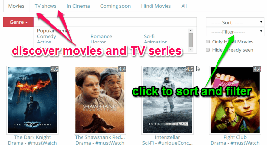 MyMovieRack is a free website to review movies and give them custom ratings. Apart from this, you can also discuss the movies with your friends. You can also rate, review, and discuss TV series too. You can discover tons of movies and TV series sorted by popularity, rating, year, and trending. It also has options for finding movies which are coming soon, in cinemas, and reviewed by top users.