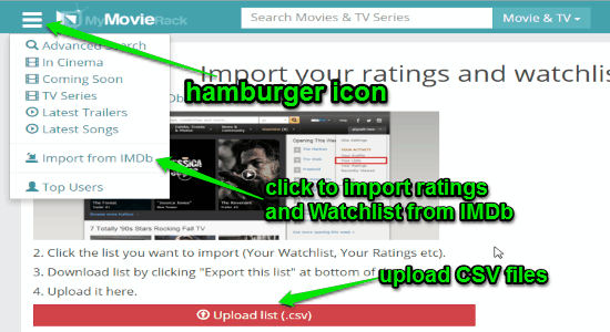 Click the hamburger button at the top of the screen and choose the option “Import from IMDB”. The following steps shows how to import ratings and Watchlist from IMDB: