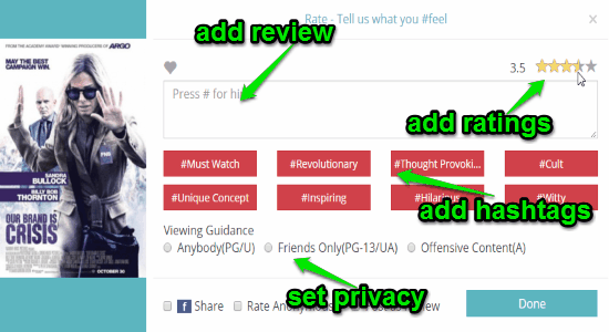 Select a movie and click the “Ratings” button to review and add the rating for a movie. You can add hashtags and set privacy for your reviews before posting. It also has an option to share your ratings and reviews via Facebook. The following screenshot shows how to rate and review a movie.
