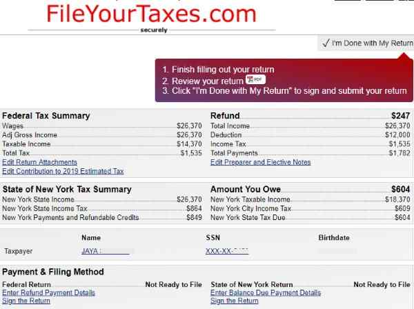 Now you will be shown a summary of both your federal as well as state tax returns. Click on the I’m done with my return button given on top of the page to continue.