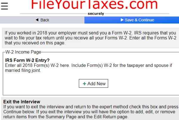 Then we come to the income section where you can add your W-2 information. Enter your EIN, employer address, wages, tax withheld, etc. Next you move on to other income categories like interest income, dividend income, unemployment compensation, business income, distributions from a IRA, etc.