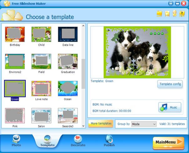 Setting up galleries can be done quickly by using one of the 31 available templates. Alternatively you can set it up from scratch. Note that there’s a lot of things that are available for tweaking. First you add photos, and also video and audio (for background music). After that the second step is to setup the template. Decorations allow you to additionally tweak the template with clip art, text, and effects. Last step is publishing, where export folder and the type of gallery is set. Small drawback of Free Slideshow Maker is that it watermarks the created galleries.