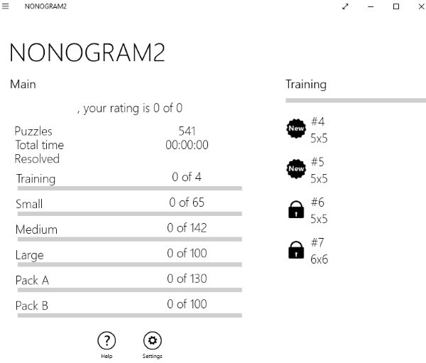 Nonogram2 is a fun puzzle game app as well. As you can see in the screenshot above, you have a training set of puzzle that you need to play first to get a hang of the game. After the training set of puzzles you move on to the next category which is small with 65 puzzles in it. Apart from this there are other categories in the game as well like medium, large, pack a, and pack b. Each category has a number of puzzles in it. So you can be sure that you will never run out of puzzles to play. The settings option at the bottom let’s you change the language of the app if you want and it has a option to mark rows which have been resolved. You can enable or disable this option easily. As you start solving puzzles your rating in terms of performance will start showing at the top of the app window.