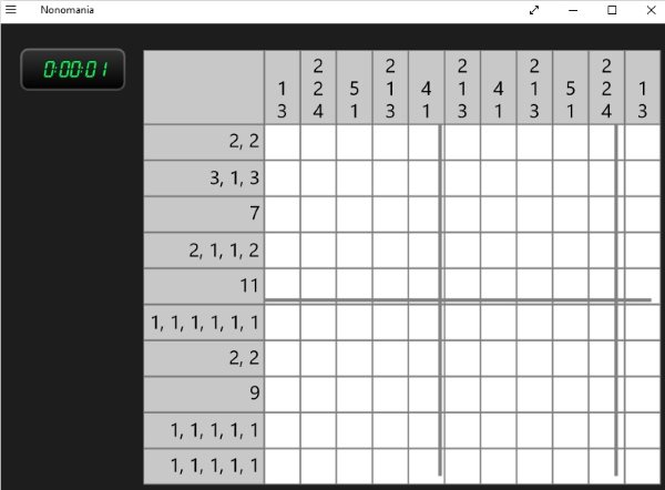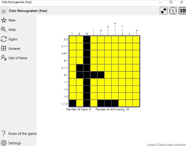 Oste Nonogramm (free) also lets you play puzzles similar to Sudoku. In this game as you can see in the screenshot above this is the home page. As soon as you start this app a game starts. Along with the game a timer also starts, to keep a track of how much time you took to solve the puzzle. On the left side of the window you will see a menu. In this menu the first option is to jump on to a new puzzle. The second option is the help option which will assess the puzzles which you have done so far and tell you if there are any errors in it. The cells with errors in them will be marked with a red cross sign. The again option basically resets the whole puzzle back to the start and you can start solving the puzzle from the beginning. The unravel option will solve the entire puzzle for you. But that would mean that you lost the game. You can check out how the game is played from the check out the rules section. The hall of fame option shows what puzzle is solved in how much time by you.