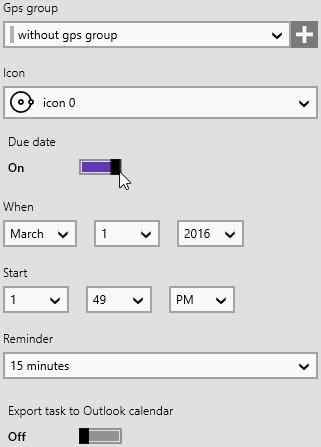 But if this is a time sensitive task then you can add a reminder to this task. On the left you will see option for adding a GPS group, an icon for the task, and a due date. Turn the due date button on and a date and time box will appear to set the date and time for your task reminder.