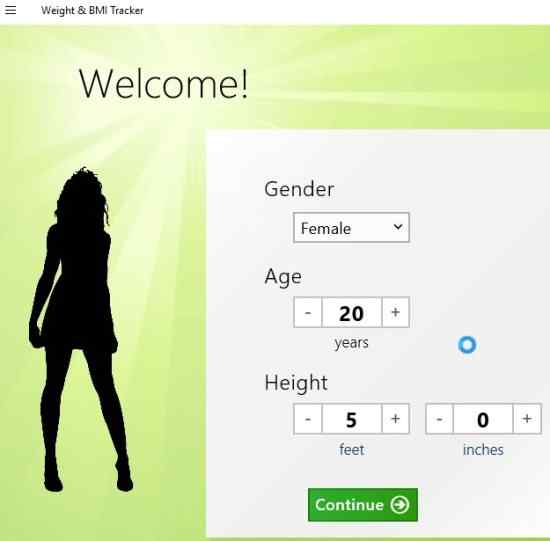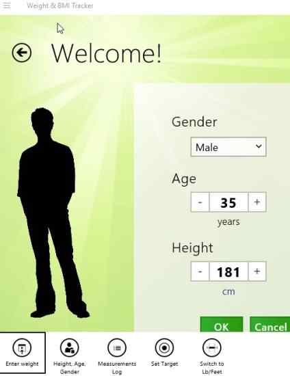When you start with this app, you will be asked to fill in some basic information like your gender, age, height and weight. Based on these, your BMI would be calculated. The below screenshot shows the first screen of this app.