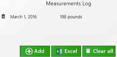 We already covered the enter weight, height, age, and gender options. The set target option will let you enter you target weight. The measurement log will show you all the entries you have made with the app so far. It will also let you add another record to your log, or export the log data into a Excel file, as shown in the screenshot below.