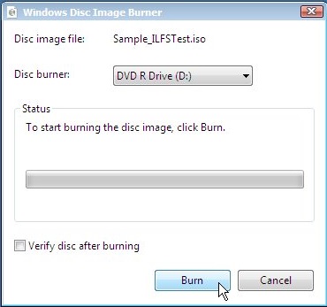 Now Windows Disc Image Burner window would appear. From there, you can choose the disc burner you want to burn the disc with. Once this is done, just click on the Burn button. This will check the existence of a recordable disc in your disc drive and initiate the burning process. Checking the Verify disc after burning option would prompt a notification when the burning process finishes.