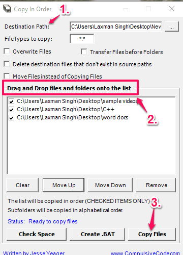 Step 2: It has a self-explanatory interface. You can select the destination path where copied folders and files will be stored, select file types (if needed), and drop files and folders in the list that you want to include in the copying process.