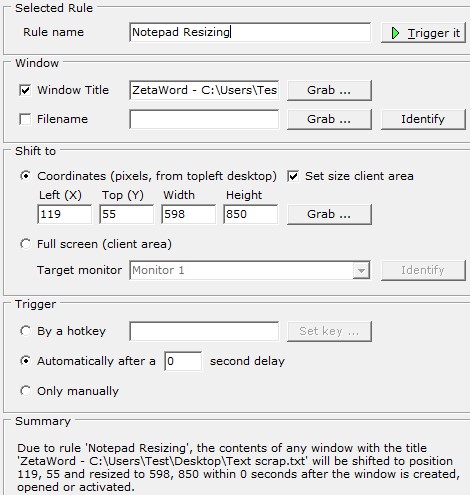 Rules can be managed in the left sidebar. New and Delete buttons down below will either add or remove window resizing and relocation rules from the list. The entire right side of the interface is for editing rules. Everything can be setup there, window name or executable name which is gonna be affected by this rule, values in pixels for the location and new window size, hotkey triggers and so on.