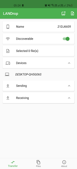 On Android, the main UI of LANDrop looks like as shown below. Here you can opt to make the device discoverable if you want to. This is can be a useful feature in case you have LANDrop installed on multiple Android devices.