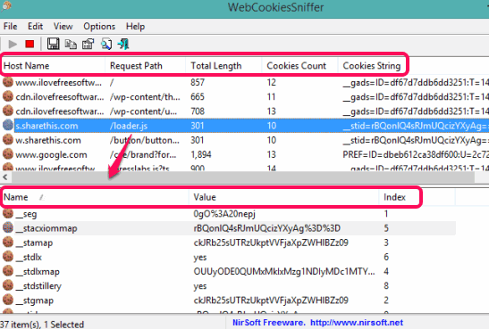 On the top part of its interface, it will show the names of webpages, request path, cookies string, and total length. To check detailed information about cookies, simply click on any webpage. After this, it will show the total number of cookies with the name of each individual cookie, index number of cookies, and value of cookies.
