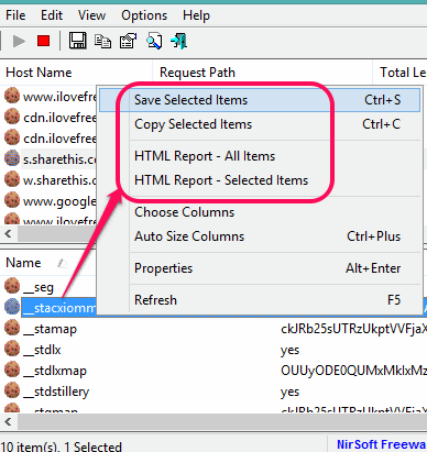 To save the data, you can use right-click context menu option. Just right click on a cookie name and save all or just selected items. You can save the report as text file, HTML file, XML file, or as CSV file.