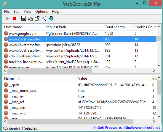 Run its application file as an administrator and its interface will open. Now you can click on Start button to enable tracking website/webpage cookies. After this, whenever you will refresh already opened webpage or will open new webpages, it will start tracking cookies sent between browser and server. See the screenshot below: