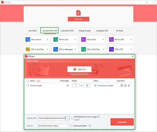 3. To Convert your PDF documents to other file formats, click on ‘Convert from PDF’, select the destination format like Word, Excel, JPG etc., drop the PDF file / files from the local system, specify the range of pages to be converted, choose the output path and then click on ‘Convert’. After the conversion is over, you will be directly navigated to the output folder from where you can open the converted file to verify. To convert other document formats to PDF, click on ‘Convert to PDF and the remaining steps are more or less the same.