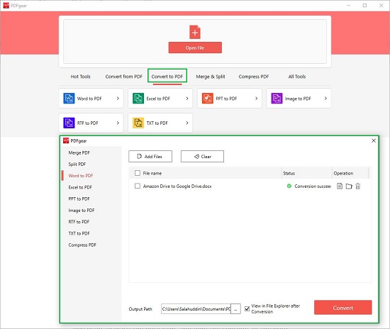 Convert to PDF: You can also use PDFgear to convert your Microsoft 365 document formats, Images (JPG, PNG, BMP etc) and plain text files to PDF documents.