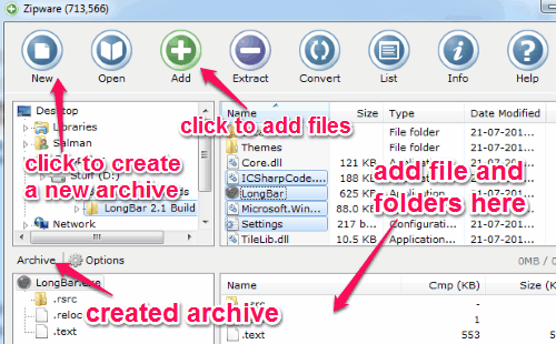 You can create an archive file by clicking the “New” icon at the top of the main window. As soon as you click the ‘New” icon, it will ask you to assign configuration of the new empty archive file, like destination folder, archive format, compression type, etc. After the new archive file is created, you can click the “Add” icon at the top to add files and folders to that particular archive file. The following screenshot shows how to create a new archive.