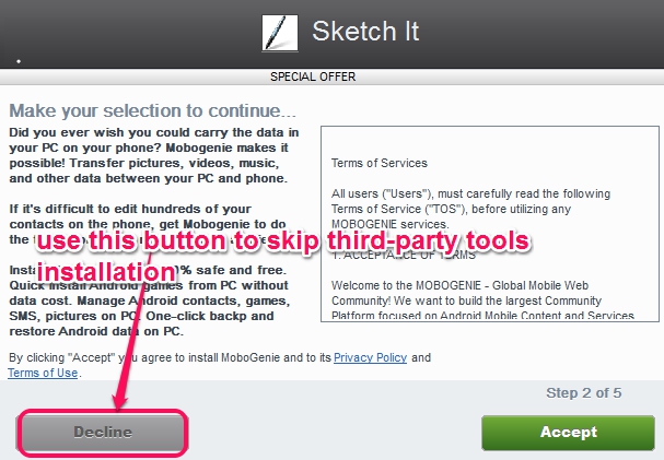 Sketch It! is just 1.5 MB in size and you can use link present at the end of this review to download it. You need to download and install it with the help of an installer. Be very careful while using the installer as multiple third-party tools will be prompted to download and install. You can easily ignore there installation by clicking the Decline button.