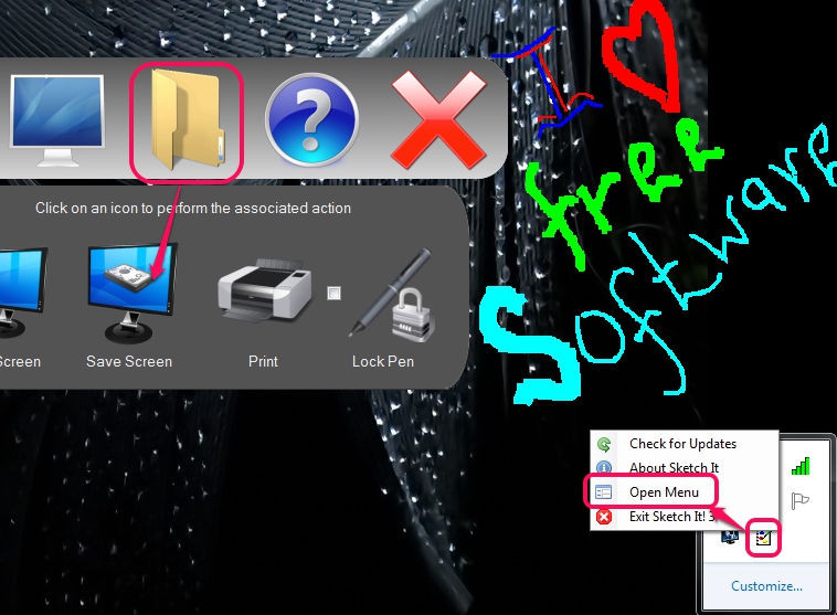 • After finishing the drawing, you can use Sketch It! menu to capture and save the drawing to any destination location on PC. Drawing can be saved in png, tiff, jpeg, gif, or in bmp image format. To save your drawing, use system tray icon of Sketch It! and access Folder icon available in menu. See the screenshot below: