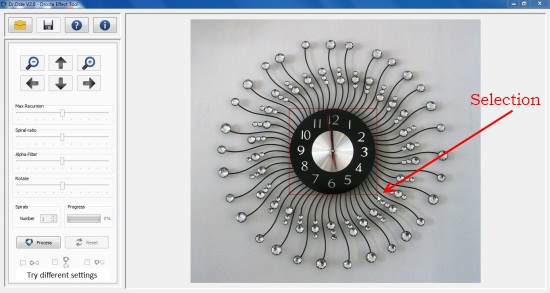 Dr.Oste Droste Effect Tool comes with a user-friendly interface and is quite easy to use. All you have to do is to browse picture from your system you want to apply Droste Effect on (Here, I am using a sample clock image I have downloaded from the internet). Once the picture is loaded, you can use your mouse pointer to make selection on the photo you want to embed recursively in the photo to create Droste Effect.