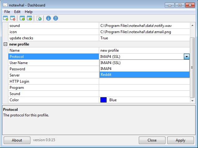 Each new account will have its own profile. From the drop down menu, you’re gonna have to select what kind of account you want to setup, IMAP, IMAP with SSL encryption or Reddit. After you select the type of account you want to use, fill out your information down below and click Apply.