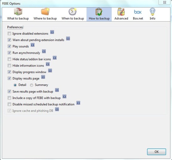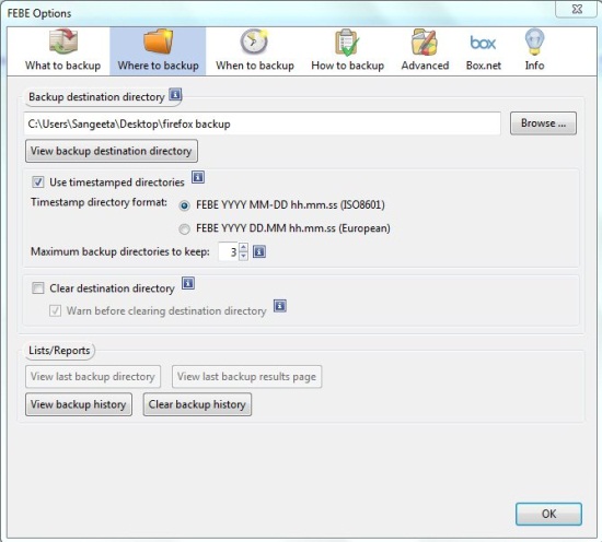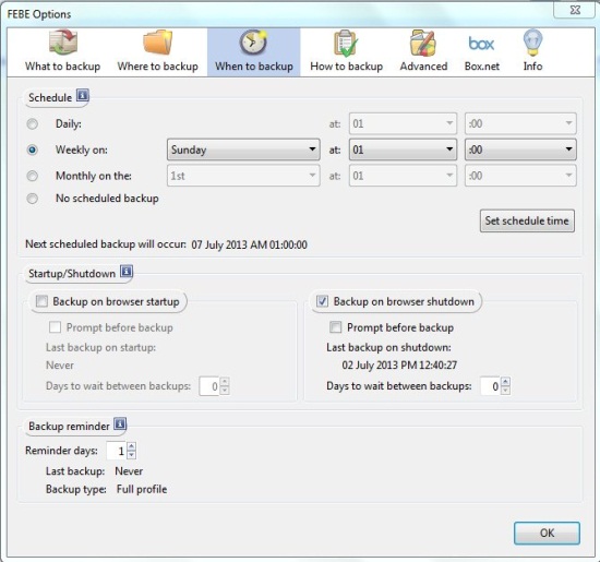 The great part is that FEBE provides flexibility in choosing the Firefox environment you want to backup, that too with an option to perform backup either on demand, or at scheduled intervals. Apart from that, it allows you to upload the backup on a cloud account (Box.net) and lets you access your Firefox profile anywhere you can access the internet.