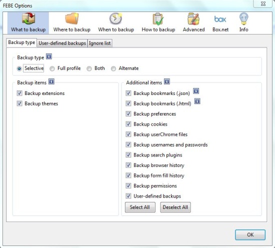 - What to Backup: Here you can specify which type of backup you want FEBE to create. By default it provides two types of backups: Full Profile and Selective. The “Full Profile” option backup your entire Firefox profile, while the “Selective Backup” allows you to backup only the selected features like extension, themes, bookmarks, etc.