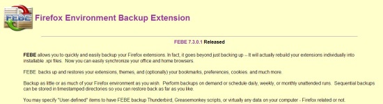 FEBE is an amazing Firefox extension that lets you easily backup your profile and quickly restore all your extensions, saved themes, bookmarks, in case you loose them accidently or switch to another PC. It’s a great tool to create scheduled backups of your Firefox profile and restore them any time you want.
