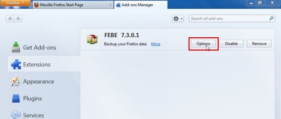 Now click on “Extensions” tab and click “Options” button. This will open a “FEBE” options window, where you can set your backup preferences.