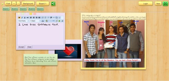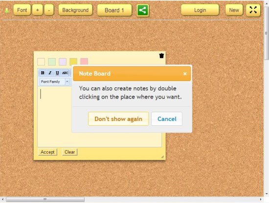 As you make a double click, a new sticky-note will appear with a tool bar on the top containing some text editing and formatting options. There you can write whatever you want, change its font, font size, text alignment, apply bullets or numbering, insert images or tables, and do other text formatting. Once you are done, you can save changes by clicking the “Accept” button. You can also change the color of each sticky-note and decorate your board with colorful sticky-notes.