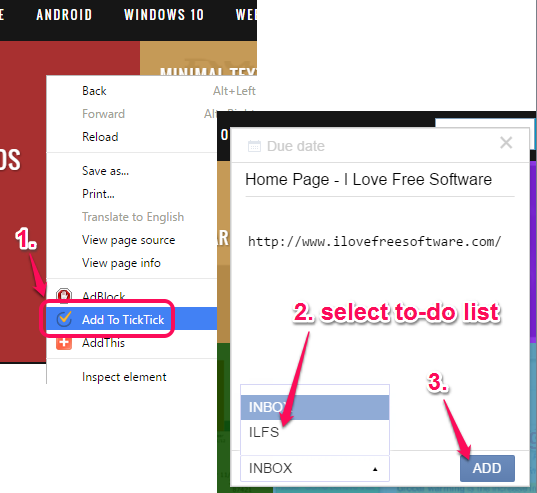 This is the most important feature of this free Chrome to-do list extension. Whenever you need to save a webpage, any link, or selected text to a particular to-do list, right-click to access Add to TickTick option. After this, a pop up will open. Using that pop-up, you can add more text or edit the link and title, and set due date for that task. After this, you can select the to-do list where you want to save the task.
