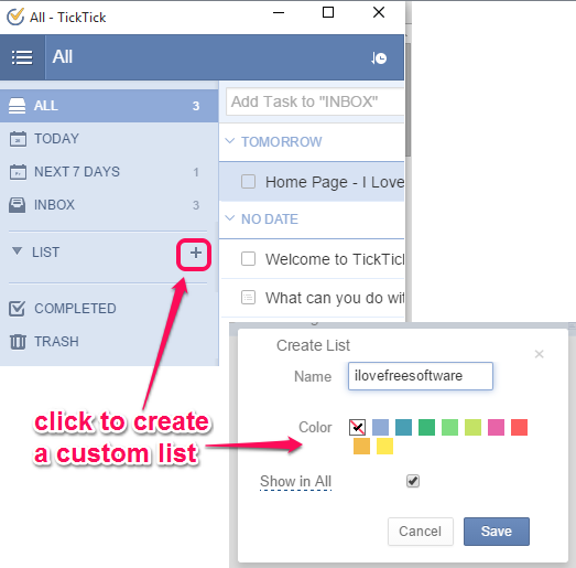 Step 3: Now you can use its pop-up window to create your custom list and add tasks to that list. Use the ‘+’ where using which you can give desired name to your list and set the color code for that list.