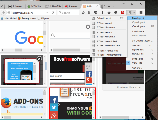 Above you can see tabs added as tiles by me using this free Tile View add-on. You will also be able to switch to some other layout or close the layout when needed. So the full control remains in your hands only.