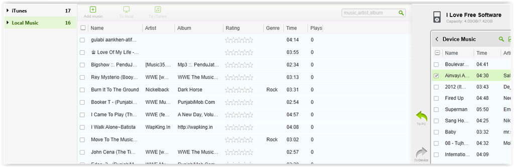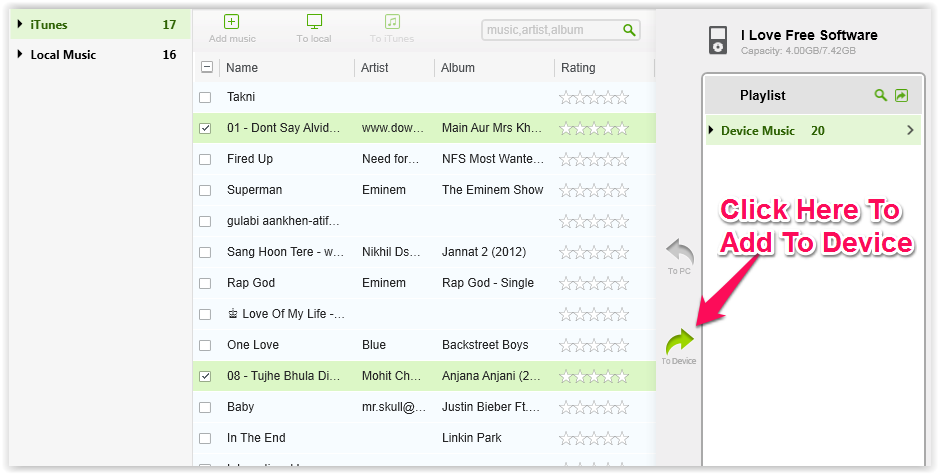 Connect your device (Android/iPhone/iPad/iPod) with the system and wait for freeware to detect it. When your device is detected, it will visible on right panel. You can also browse the music files and playlists of your device from this panel. Now, lets suppose you want to add any music file from iTunes to your device. Click on iTunes option at left panel and select the number of songs which you want to transfer. After selecting, you will see that the options labeled with To Local and To Device have become highlighted. Click on To Device option for transferring the file to your device. You can also select the name of the playlist in which you want to add the files.