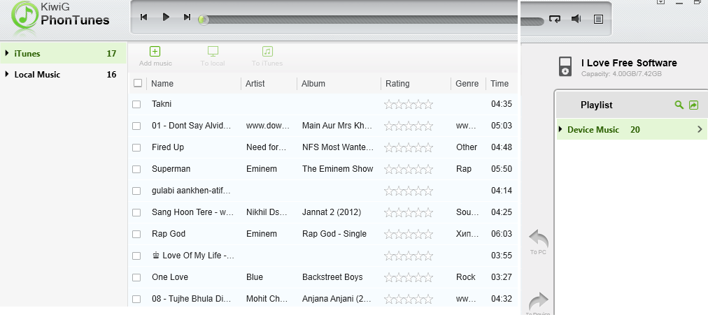 You can get the KiwiG PhonTunes by clicking on the link given at the end of this review. After installing the freeware, run it and you will see the interface similar to the one shown in the screenshot below. It automatically scans for the music files stored in your iTunes Library and displays them in the freeware. You can see that there are two options in the left panel: iTunes and Local Music. As the name suggests, the iTunes option contains your iTunes files while the Local Music option contains the files which you don’t want to store on iTunes.