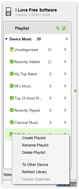 This freeware also lets you create and manage playlists. To create playlist, go to right panel and select your device. Now, right click on any playlist’s name. You will see the following options: Create Playlist, Rename Playlist, and Delete Playlist. Just click on the option depending upon the operation you want to perform.