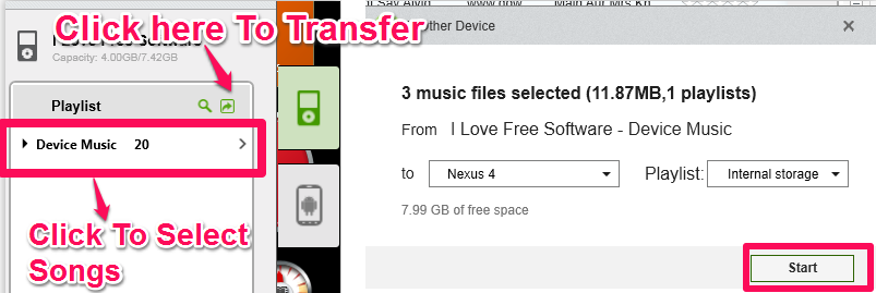 To transfer music files between multiple devices, first connect the devices to your PC. You will see the list of all the devices detected by the freeware on the right panel. You can switch between them easily by clicking on their icons. As you can see from the screenshot that I have connected an iPod and an Android device with the PC. Now lets suppose, you want to transfer files from iPod to Android device. Select the songs from the iPod’s playlist which you want to transfer to Android device. After selecting the songs, click on the small green color icon at the top right corner. The freeware will display all the songs selected by you. Just click on Start option to transfer the files.