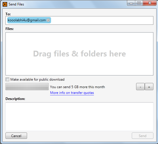 You may even transfer files using this software by clicking on the send file option at the top. You just need to enter the email id of the person you wish to transfer the files and drag and drop the files or folders which you wish to be transferred. The space provides you to send up to 5 GB file each month with an option to check the field ‘’make available for public download’’. The bottom most section named Description provides you the space to add the description related to the file that has been backed up. Lastly click on the send option at the bottom most section and the file would be sent to the respective email address.