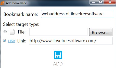 To add a bookmark, simply hit on ADD BOOKMARK option available on its interface and it will open a new window. In that window, provide any name for your bookmark and its target type. For example, if you are adding a web-link, then select Link option (see the below screenshot) and provide the address. After that, hit the ADD button and your bookmark will be saved which you can see on main interface of Bell Bookmarks.