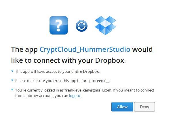 Image above shows us the Dropbox access authorization, through which you need to go so that Crypto Cloud has access to your account. Access is needed so that files which are encrypted can be uploaded to your online account, and once that you need them, so that they can be downloaded and decrypted. All the files that you manage with Crypto Cloud are automatically password protected and encrypted and uploaded, so you don’t have to do anything manually.