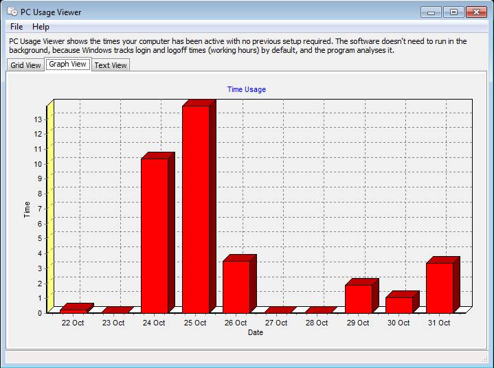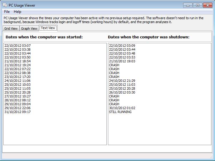PC Usage Viewer is a free computer usage viewer which you can use in order to see how many hours your computer has been used on a particular day. You can check the total time that it has been working, that it was used, and of course view the exact time that it has been turned off. Apart from standard Windows usage, like turn on, turn off and working hours, PC Usage Viewer will also display the exact times that system crashes happened.